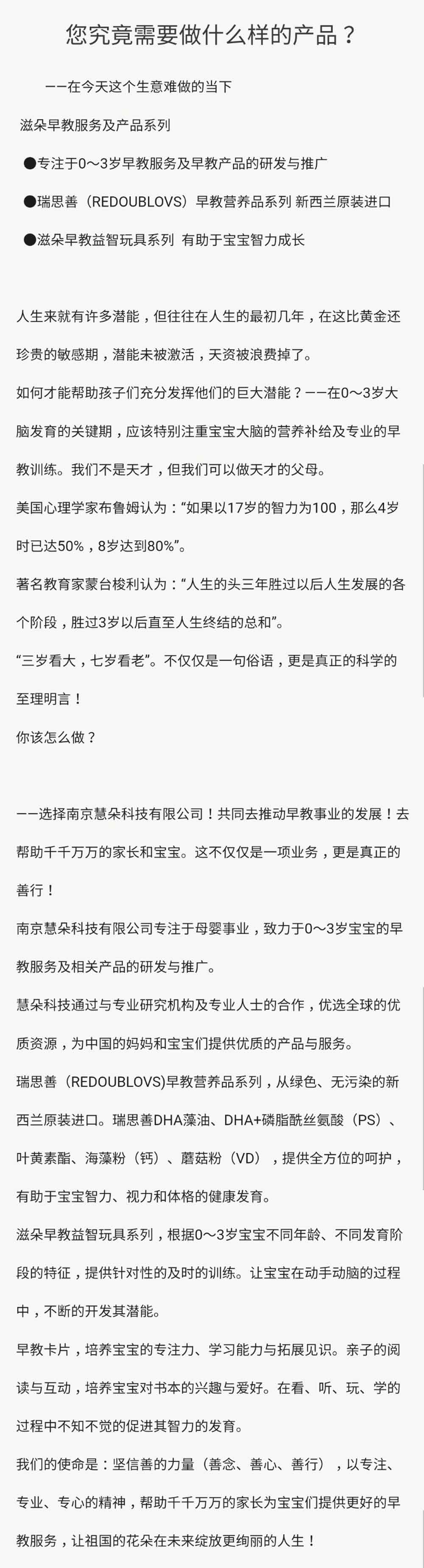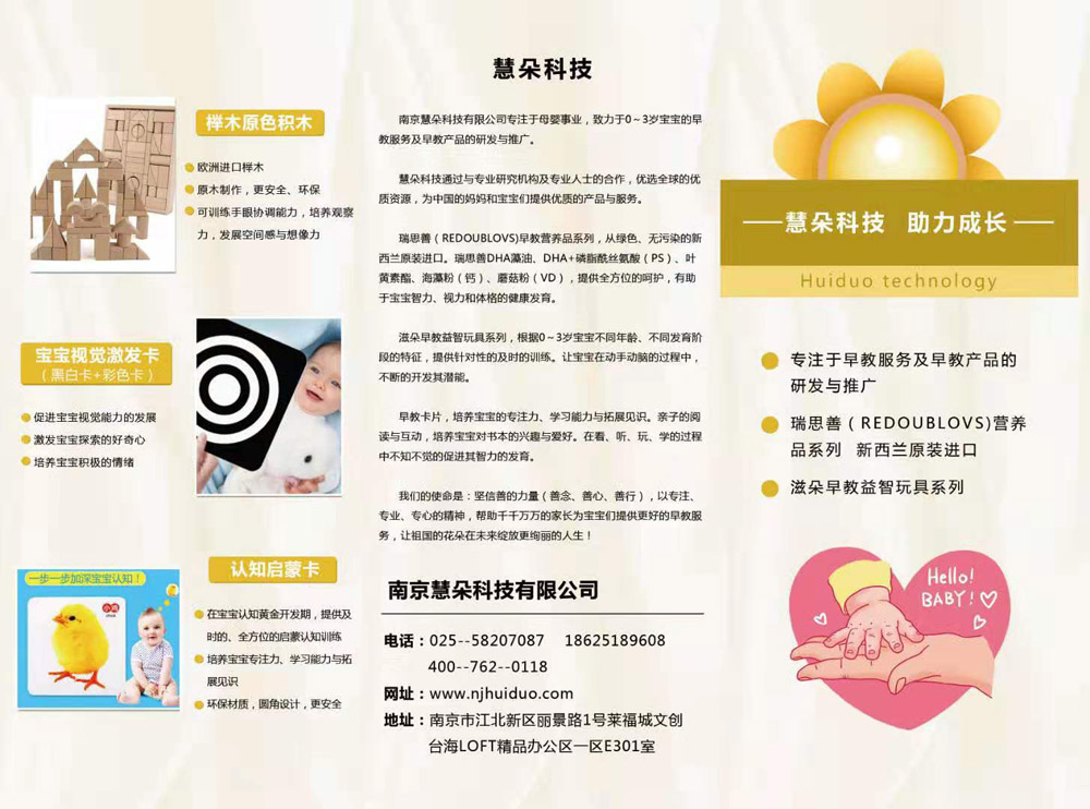 南京慧朵科技有限公司專注于母嬰事業(yè),致力于0~3歲寶寶的早教服務(wù)及相關(guān)產(chǎn)品的研發(fā)與推廣。