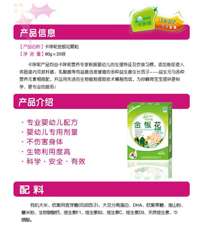 卡咪呢有機米粉系列是專為中國寶寶設計的營養(yǎng)輔食,選用有機大米,科學搭配維生素AD等維生素,還特別添加牛磺酸、DHA、AA等有助智力發(fā)育的營養(yǎng)成分,富含15種營養(yǎng)素,F(xiàn)上?ㄟ淠啬笅胗闷酚邢薰久嫦蛉珖瞻资袌鰠^(qū)域誠招卡咪呢有機米粉代理商。