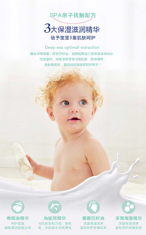 貝施康Spa潤膚油是 “深海優(yōu)萃”系列的母愛產(chǎn)品,根據(jù)嬰兒特殊肌膚PH特點(diǎn)研制,從深海中萃取自然純凈成分,配方做到純正安全,讓媽媽心安!