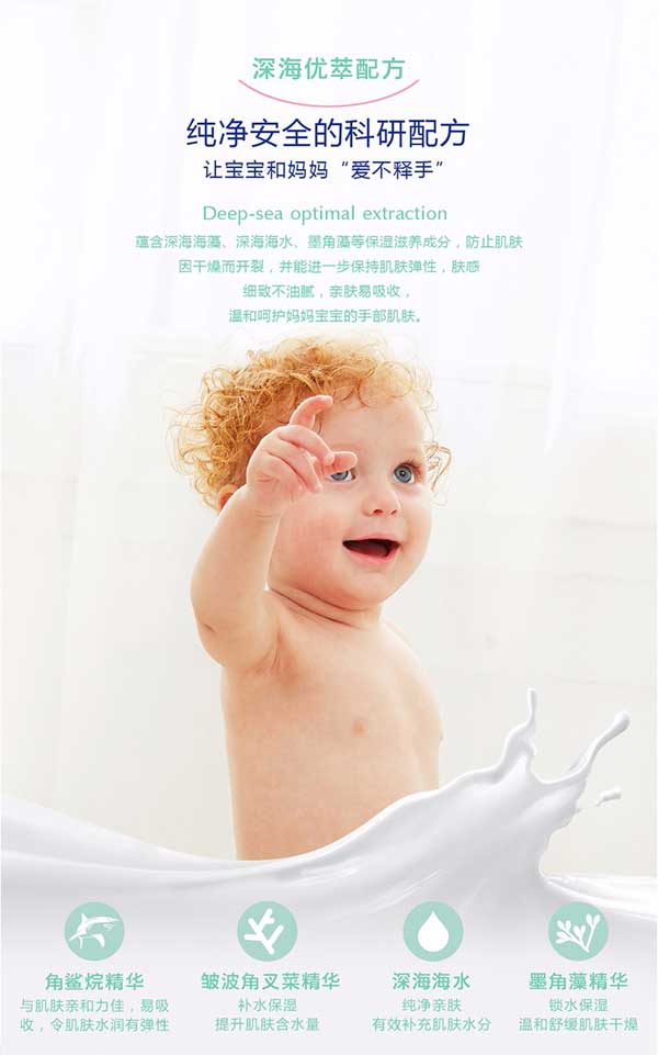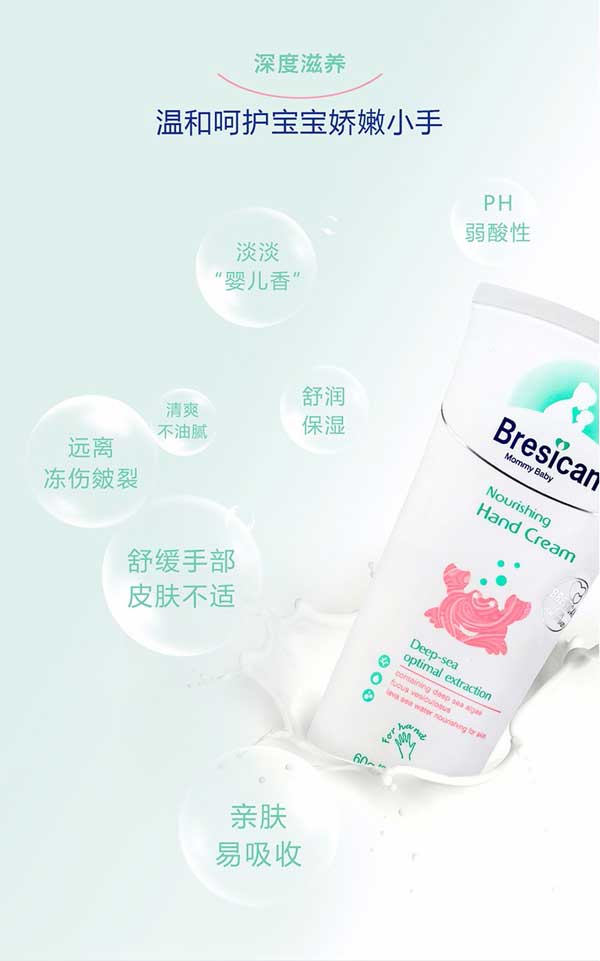 Bresican貝施康滋養(yǎng)護(hù)手霜是 “深海優(yōu)萃”系列的護(hù)手產(chǎn)品,根據(jù)嬰兒特殊肌膚PH特點(diǎn)研制,從深海中萃取自然純凈成分,配方做到純正安全,讓媽媽心安!