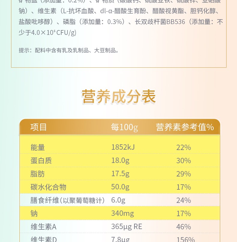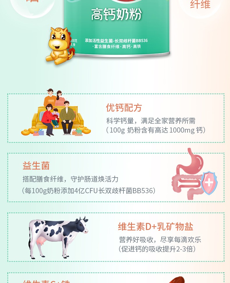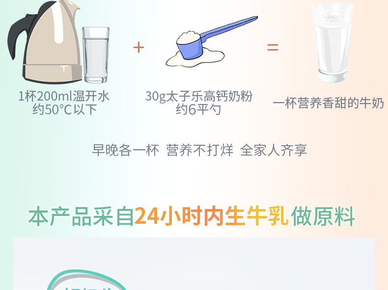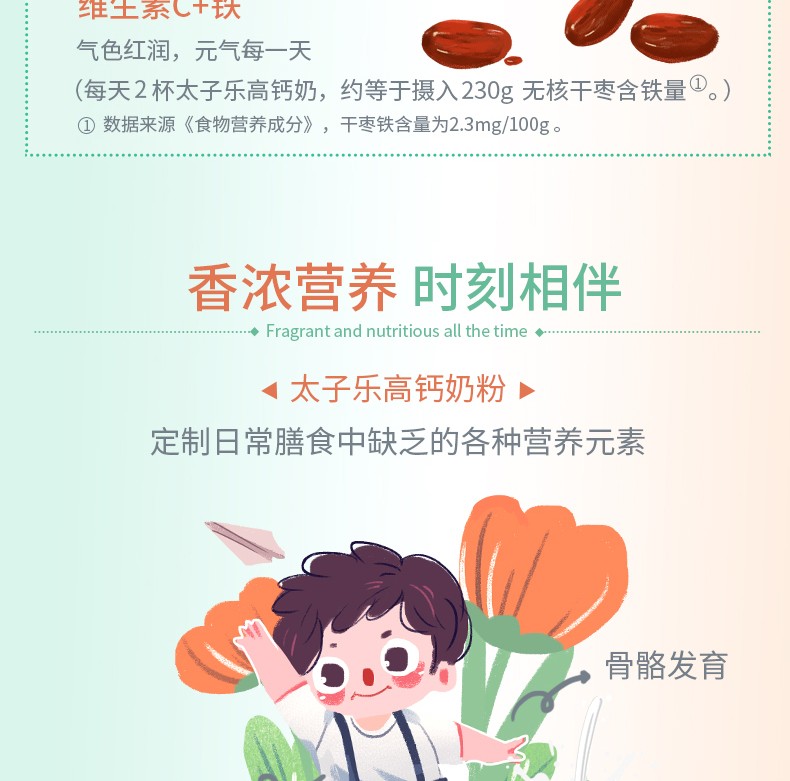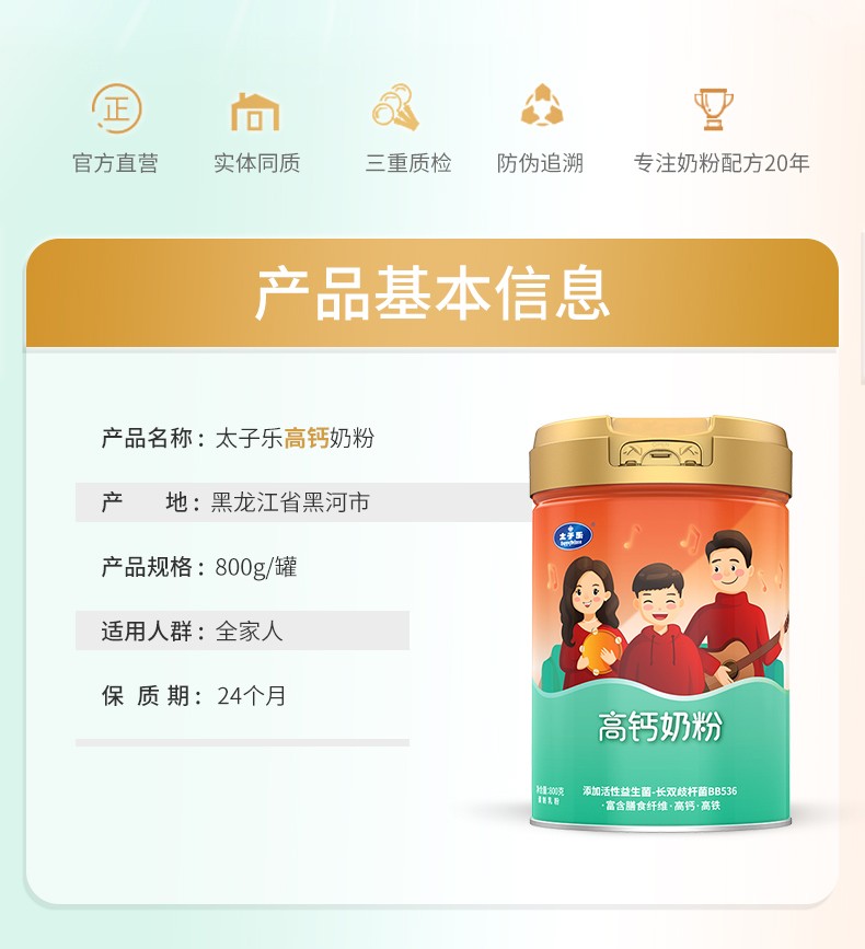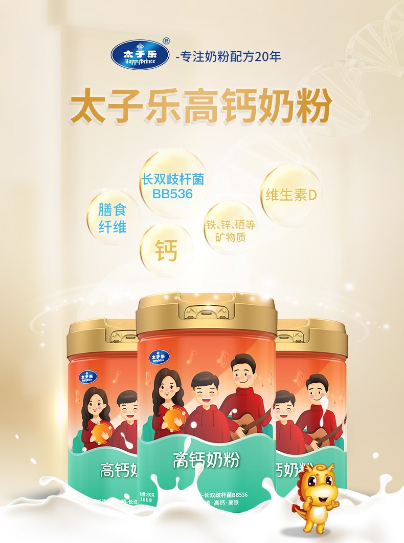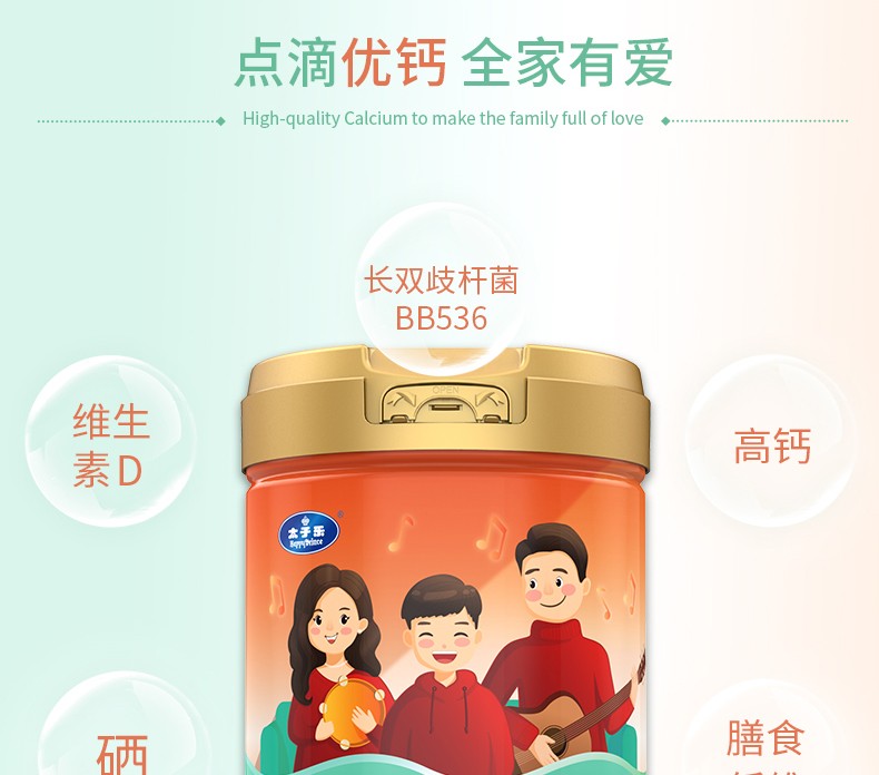 太子樂高鈣奶粉定制日常膳食中缺乏的各種營養(yǎng)元素,長雙歧桿菌BB536、鈣、硒、膳食纖維等,科學(xué)配比鈣含量,滿足全家營養(yǎng)所需。