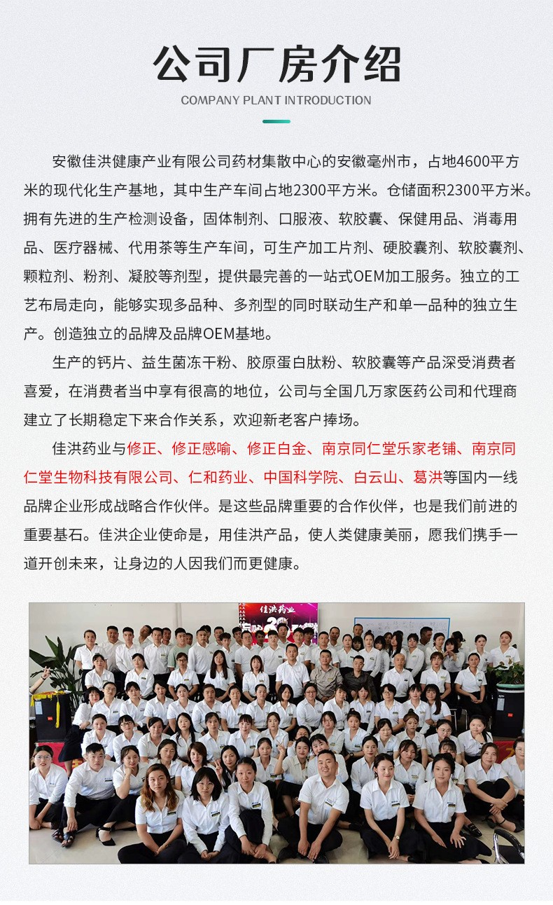 安徽佳洪健康產(chǎn)業(yè)有限公司位于全球最大的中藥材集散中心安徽亳州市,占地4600平方的現(xiàn)代化生產(chǎn)基地,其中生產(chǎn)車間占地2300平。倉(cāng)儲(chǔ)面積2300平。國(guó)際先進(jìn)的生產(chǎn)檢測(cè)設(shè)備,固體制劑、口服液、軟膠囊、保健用品、消毒用品、醫(yī)療器械、代用茶等生產(chǎn)車間,可生產(chǎn)加工片劑、硬膠囊劑、軟膠囊劑、顆粒劑、粉劑、凝膠等劑型,提供最完善的一站式OEM加工服務(wù)。獨(dú)立的工藝布局走向,能夠?qū)崿F(xiàn)多品種、多劑型的同時(shí)聯(lián)動(dòng)生產(chǎn)和單一品種的獨(dú)立生產(chǎn)。創(chuàng)造獨(dú)立的品牌及品牌OEM基地。