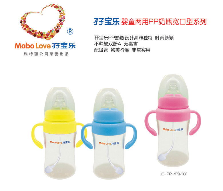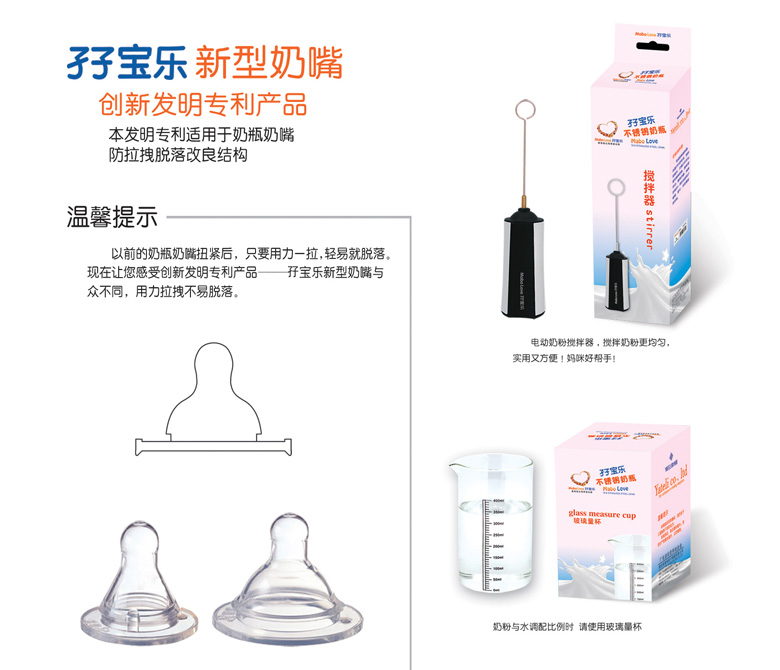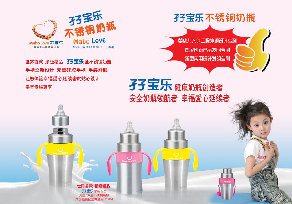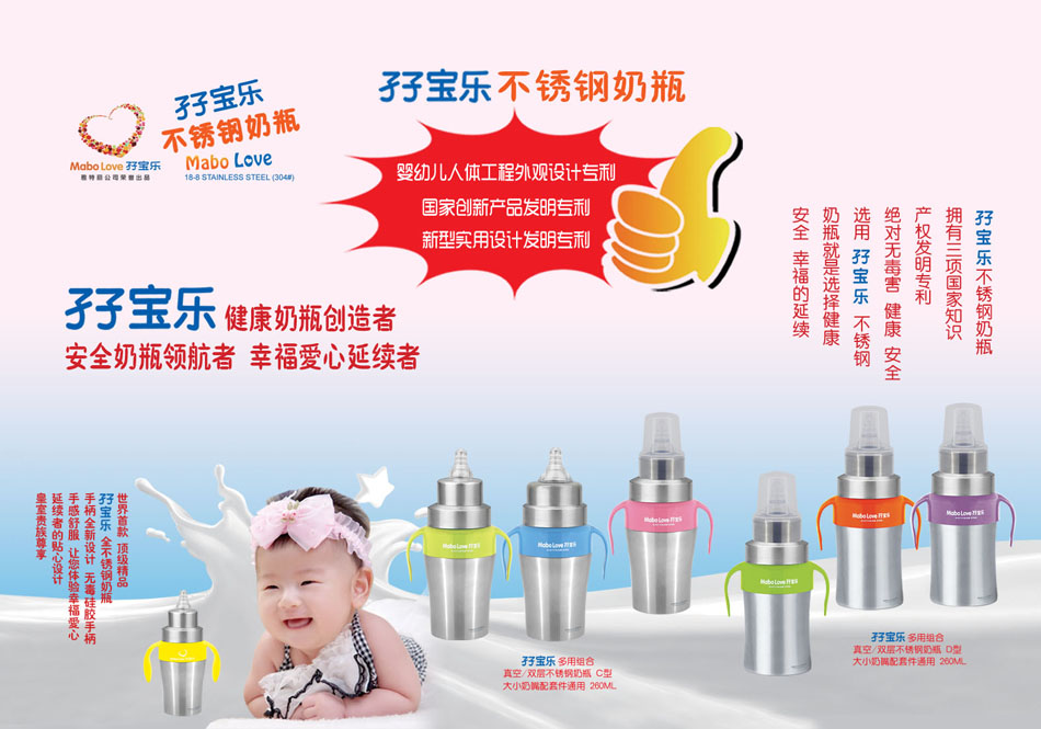 孖寶樂是雅特麗公司旗下孕嬰童用品注冊商標,孖寶樂不銹鋼奶瓶擁有國家創(chuàng)新產(chǎn)品發(fā)明專利,新型實用設計發(fā)明專利,嬰幼兒人體工程外觀設計專利三項國家知識產(chǎn)權發(fā)明專利。孖寶樂就是健康奶瓶創(chuàng)造者,安全奶瓶領航者,幸福愛心延續(xù)者。與其它奶瓶自然形成差異化,堅信它具有非常市場潛力,誠邀有識之士,共同開拓廣闊市場,共創(chuàng)雙贏。
