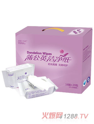 “蒲公英潔凈紙”定位是生活品質(zhì)要求較高的中高端女性群體,選用木質(zhì)纖維制造,提取有“天然抗生素”之稱的中草藥“蒲公英”植物精華,經(jīng)科學(xué)研制溶入而成,適用于女性便后清潔擦拭,是以擦代洗的全新呵護(hù)型衛(wèi)生潔凈用品,讓您一擦如洗,清爽潔凈。工作、旅行隨身攜帶,時(shí)尚又方便,干凈一整天。保。河行П苊饧(xì)菌滋生而引發(fā)各種婦科疾病的問題,達(dá)到殺菌、消除異味、舒爽的作用。輕輕擦拭水分瞬間揮發(fā),全面呵護(hù)女性健康。舒適:便后清潔,一擦如洗。“蒲公英潔凈紙”含濕適中,擦拭后如水洗般清爽干凈。方便:隨時(shí)隨地呵護(hù)健康。人性化包裝,抽取方便,開啟后密封性極佳,不受污染,長(zhǎng)年保持含濕度,易于攜帶。