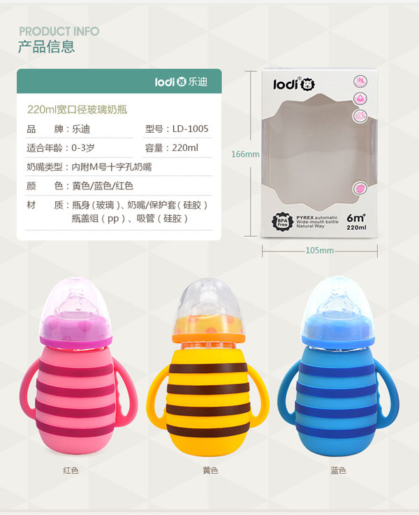 樂迪小蜜蜂硅膠套玻璃奶瓶產(chǎn)品展示