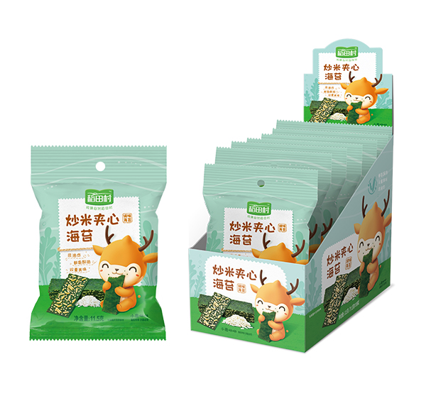 稻田村夾心海苔,鮮香酥脆,雙重美味。不加食品添加劑;不加醬油、不加味精;不加食用油,烘焙非油炸;選用品質紫菜,色澤自然墨綠,片薄均勻,鮮嫩有光澤,有紫菜本身的清香;科學搭配紫菜與酥脆夾心的比例,甜度適中,口感鮮香。