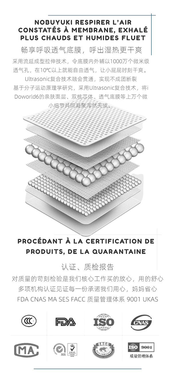 Ultrasonic復(fù)合技術(shù)融會貫通,實現(xiàn)不成團斷裂;诜肿舆\動原理學(xué)研究,采用Ultrasonic復(fù)合技術(shù),將iDoworld6的親膚面層、雙核芯體、透氣底膜等上萬個微小細節(jié)共同凝聚渾然夭成。